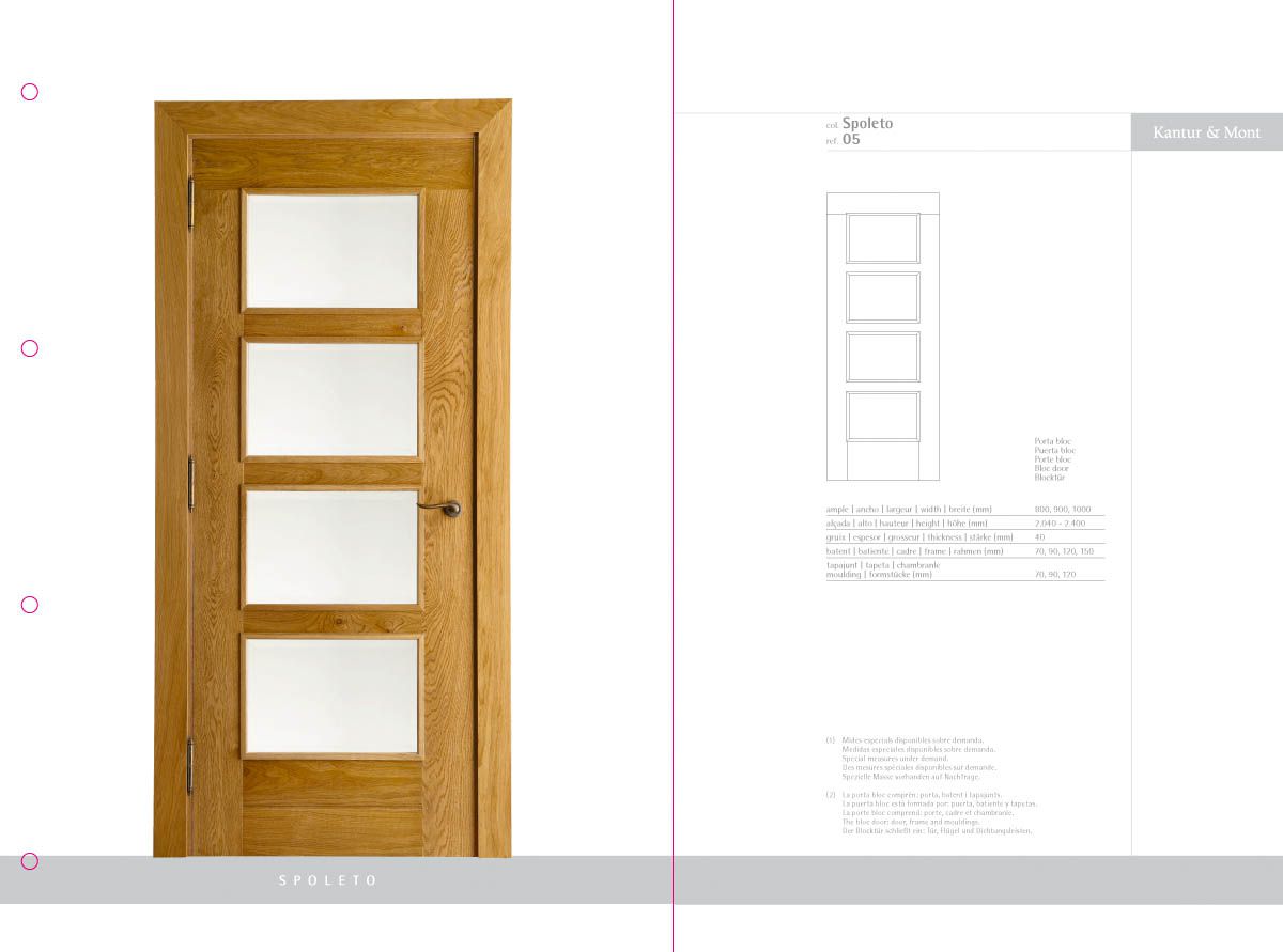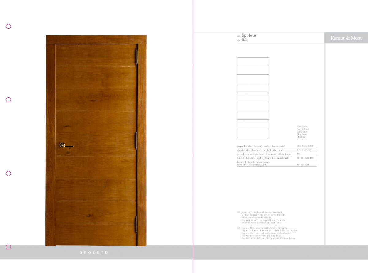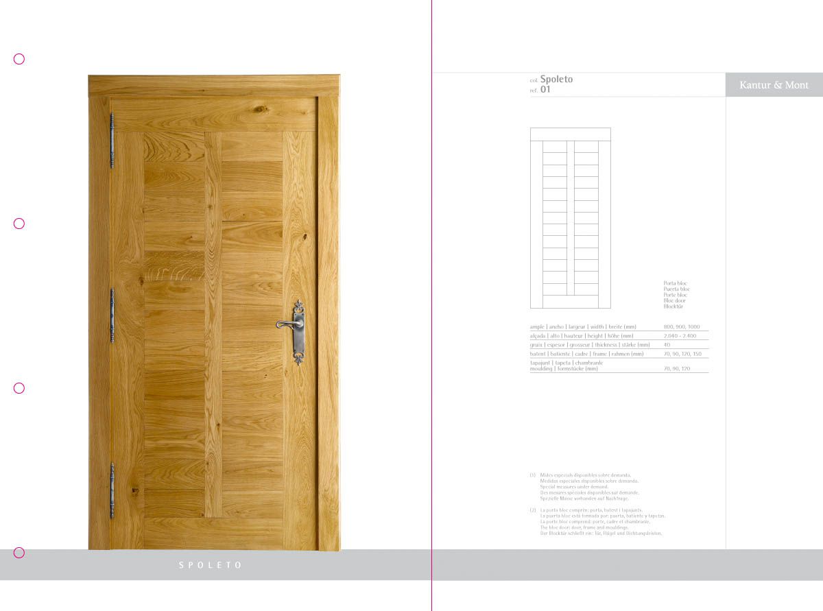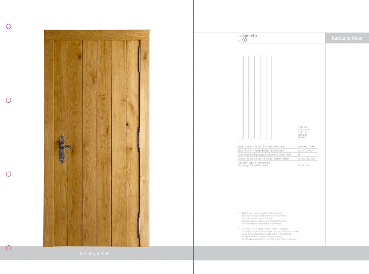 Desenvolupament d’un catàleg de producte com a eina comercial i mostrari de producte, a partir de la idea creativa original i la seva implementació en format de fitxes incloses en una carpeta d'anelles per a properes incorporacions de noves referències. El treball inclou la fotografia de les portes i detalls de producte.