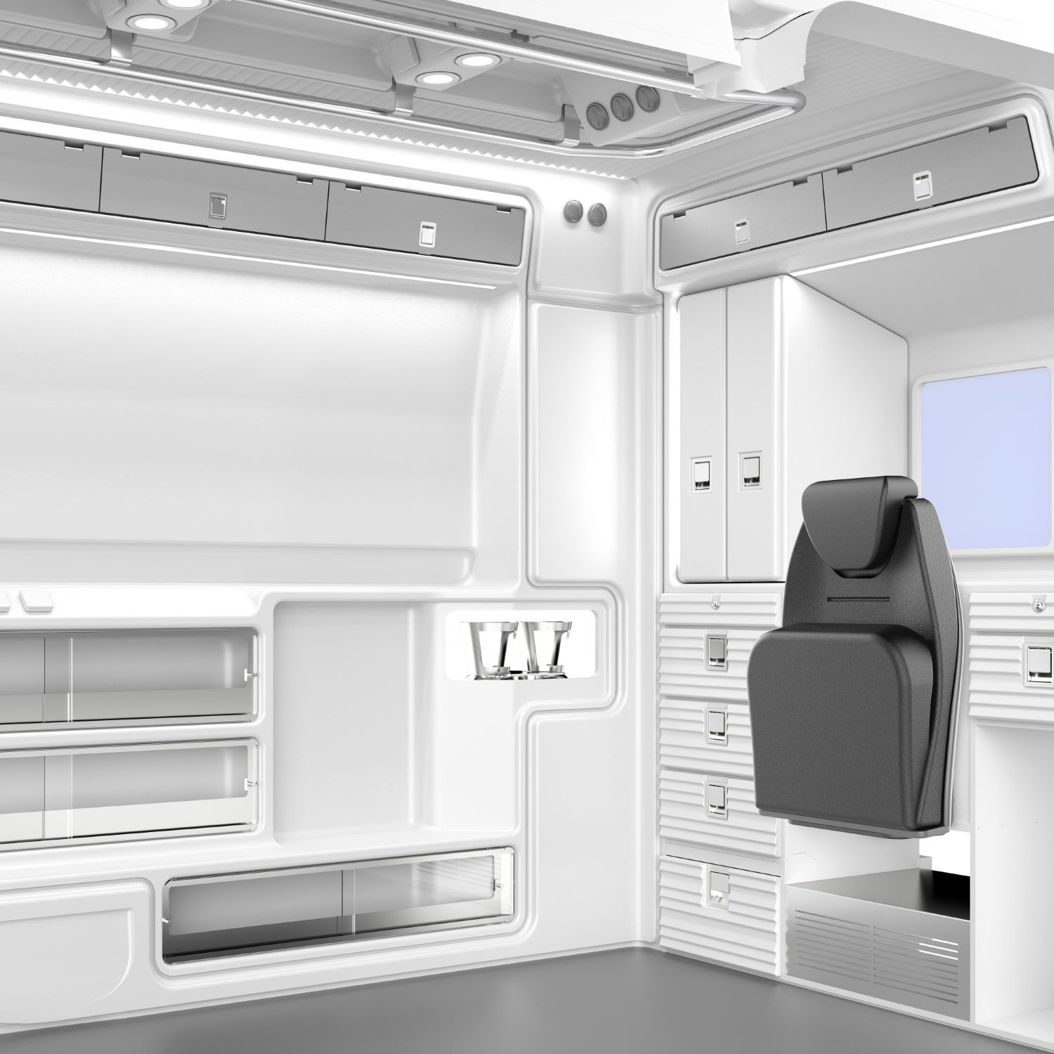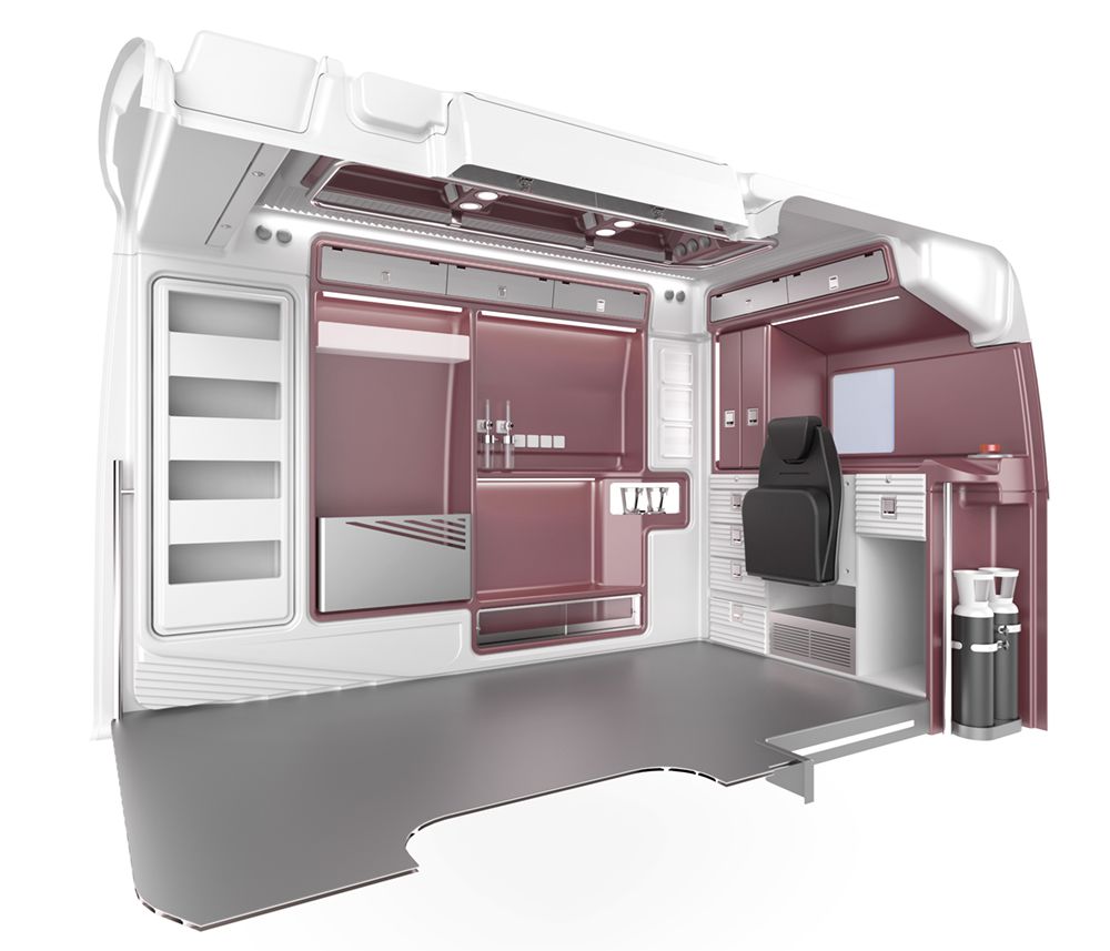 Cal destacar que aquesta unitat està realitzada segons l'última tecnologia i segons les directrius de la normativa europea. La cabina assistencial està realitzada amb làmines d'ABS, un material altament resistent a l'impacte, amb una magnífica resistència tèrmica i química, així com excel·lents propietats de termoformat. Gràcies a aquest material, s'obtenen superfícies llises en què s'eliminen cantonades, es minimitzen els angles i es redueix molt el pes de la transformació.