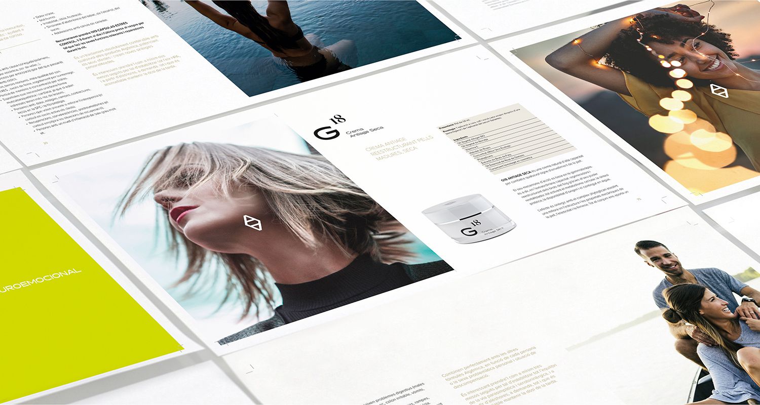Diseño y maquetación del catálogo de productos Algēmica. Es un catálogo dedicado exclusivamente a los profesionales que comercializan la marca Algēmica. Una importante herramienta para explicar al consumidor, las características de los productos Algēmica y también es un manual de consulta y formación para los profesionales, ya que incluye características técnicas sobre los ingredientes y la composición de los productos. Por este motivo es un catálogo comercial y, a la vez, un manual de consulta y herramienta de formación para el personal.