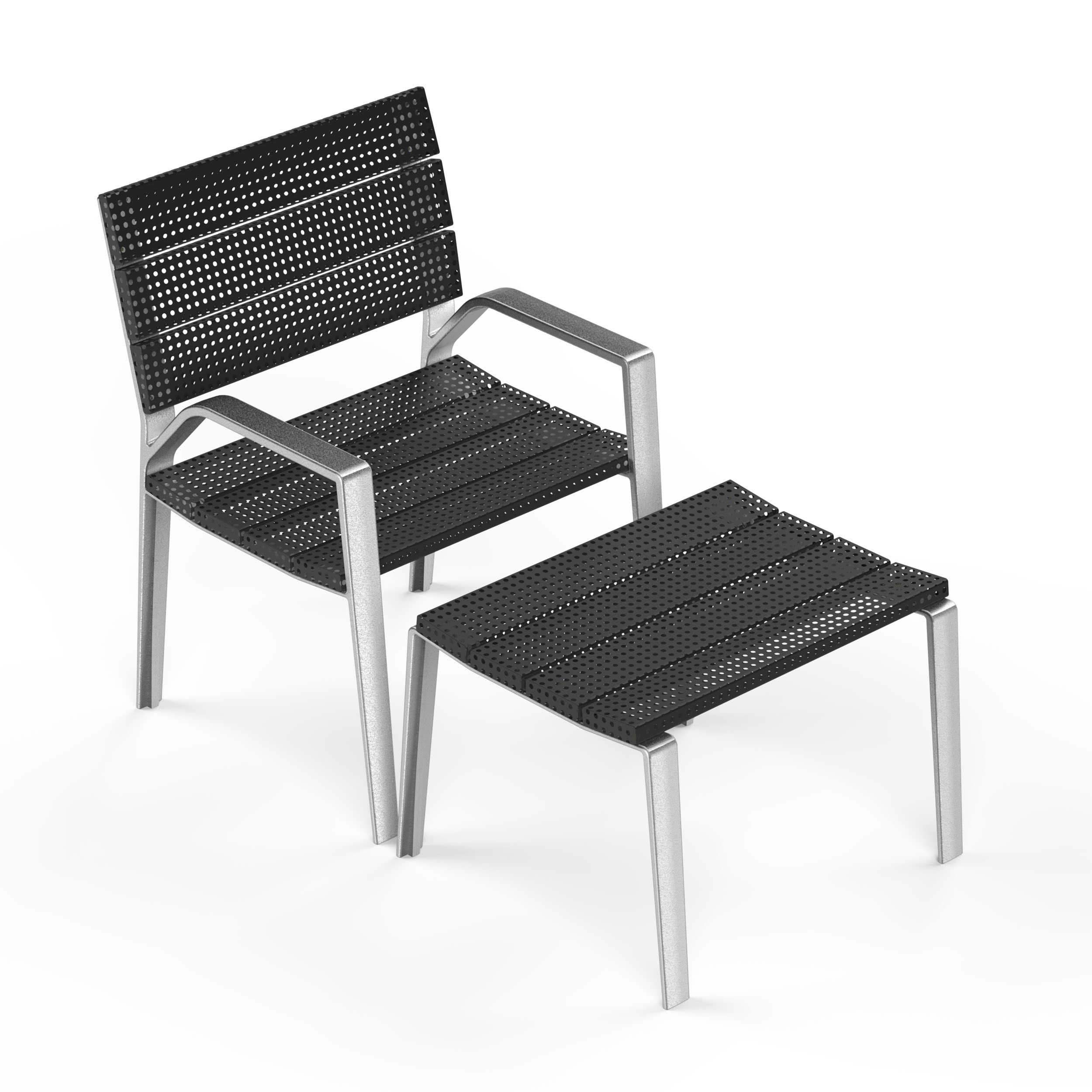 Concretamente, se trata de un banco con dos elementos diferenciados. El primero, la estructura básica y minimalista que se puede realizar en aluminio, material 100% reciclable, o hierro reciclado, y el segundo, el asiento que se puede realizar en hierro perforado o plástico 100% reciclado, sin plástico añadido.